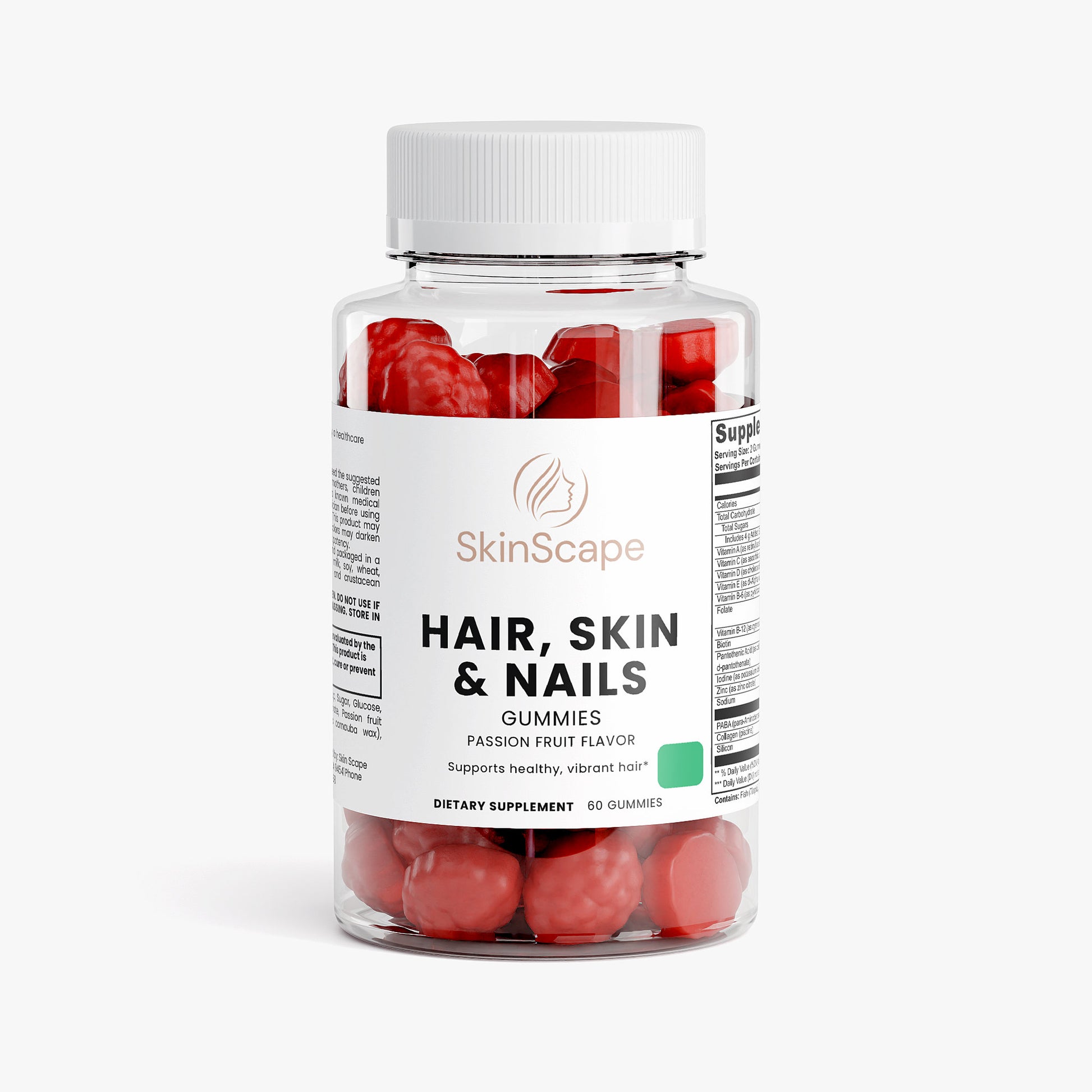 Ingredients: Vitamin A (as retinyl acetate), Vitamin C (as ascorbic acid), Vitamin D (as cholecalciferol), Vitamin E (as dl-Alpha tocopheryl acetate), Vitamin B-6 (as pyridoxine HCI), Folate, Vitamin B-12 (as cyanocobalamin), Biotin, Pantothenic Acid (as calcium d-pantothenate), Iodine (as potassium iodide), Zinc (as zinc citrate), PABA (para-Aminobenzoic Acid), Collagen (piscine), Silicon, Glucose syrup, Sugar, Glucose, Pectin, Citric acid, Sodium citrate, Passion fruit flavor, Vegetable oil (contains carnauba wax), Purple carrot juice concentrate.